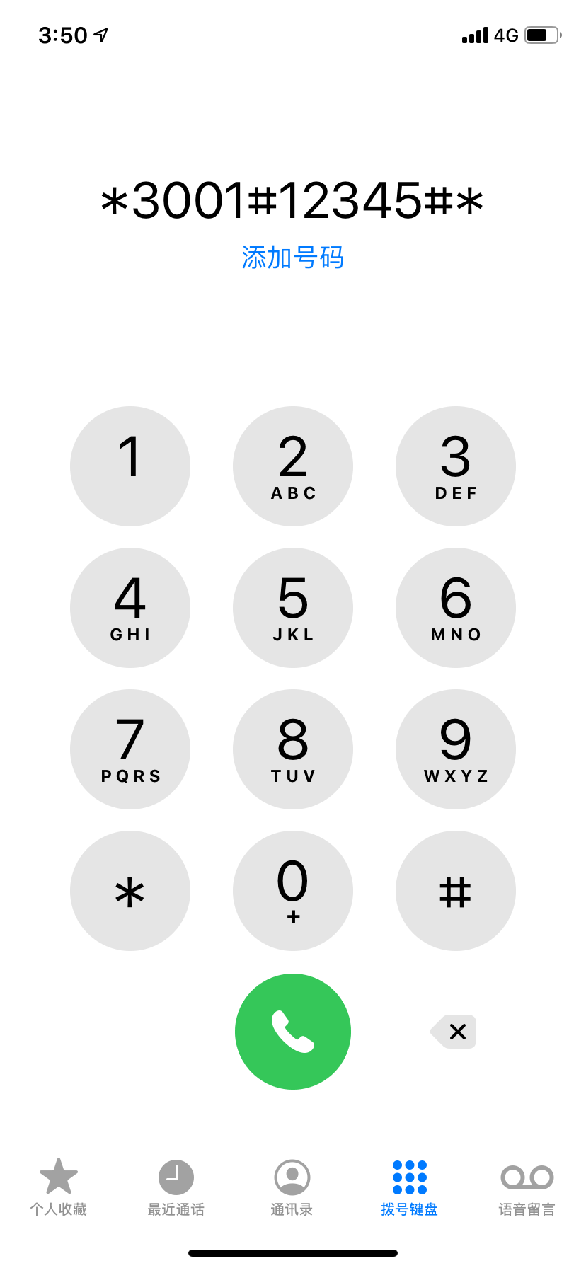 iPhone手機查信號強度是非常簡單的,首先我們打開撥號盤輸入(*3001#12345#*)