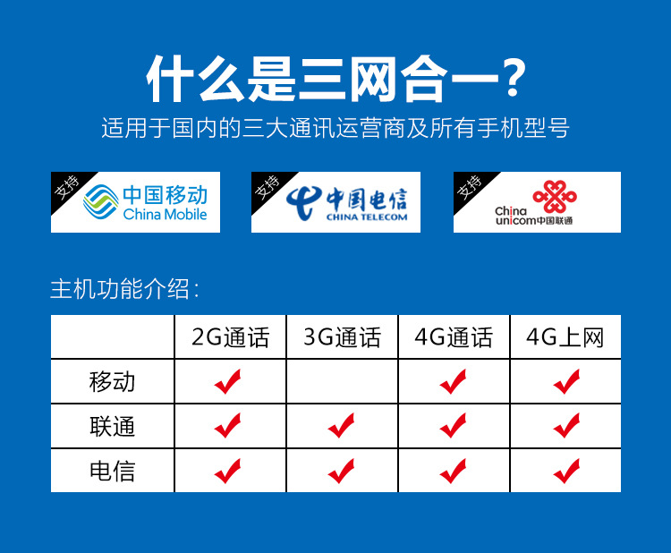 產品描述:頻段:850+900+1800+2100 增強:移動聯通電信三網打電話+三網4G上網(移動4G的僅支持900 1800頻段上網)