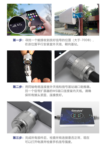 ③ 用室外饋線將室外天線與放大器的IN接口連接,注意要擰緊接口。室外接收天線,他的作用是能夠接受通基站的信號。饋線的長短會影響信號的強度,越長信號損耗大。